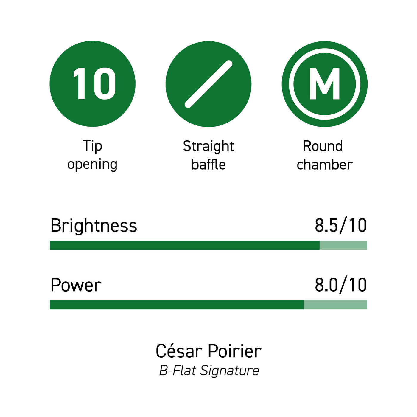 Despite the larger opening, the César Poirier mouthpiece has a focused sound thanks to a significant table length and a small round chamber which facilitate the emission and bring brilliance and projection.