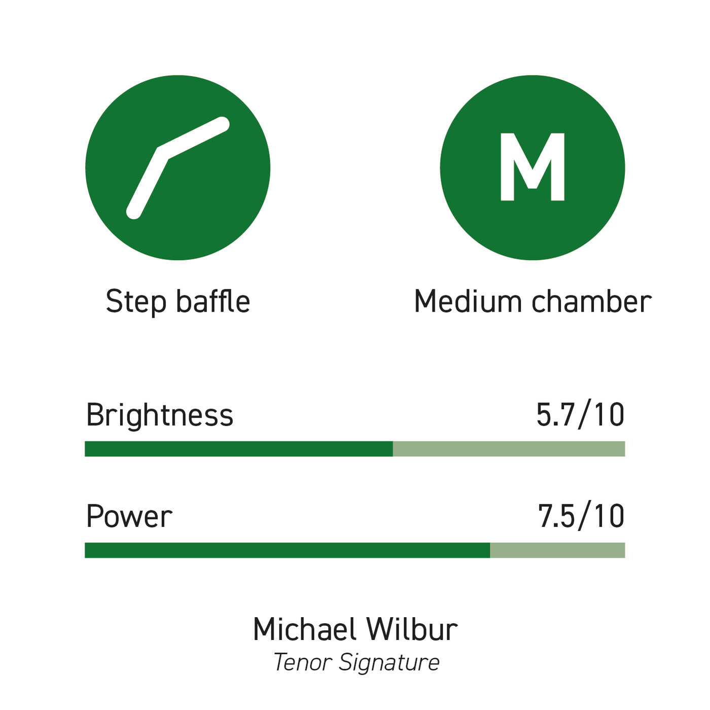 A low and long step baffle paired with a medium chamber gives the Michael Wilbur Signature a deep, powerful and flexible sound with great playability.