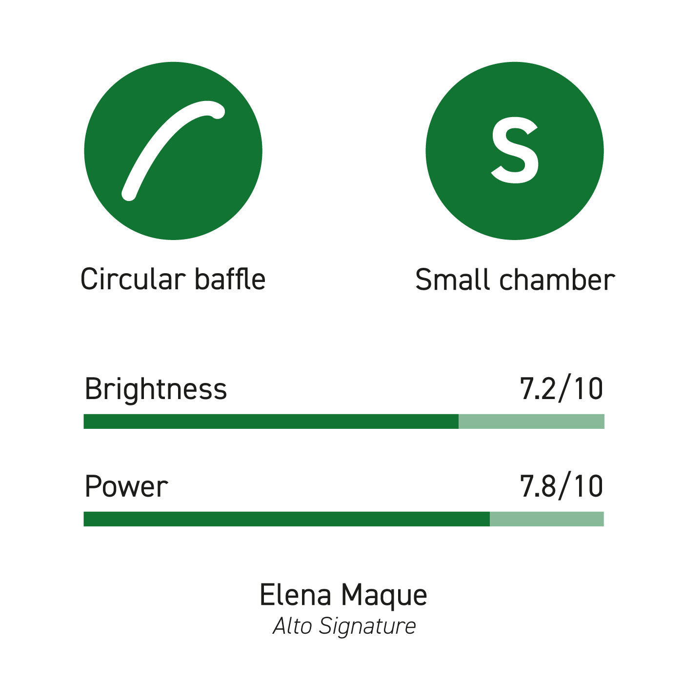 Elena Maque's signature mouthpiece has a slightly raised circular baffle with ridges inside to boost the power, and a medium chamber, which gives a powerful and quite bright sound while keeping some flexibility in the tone.