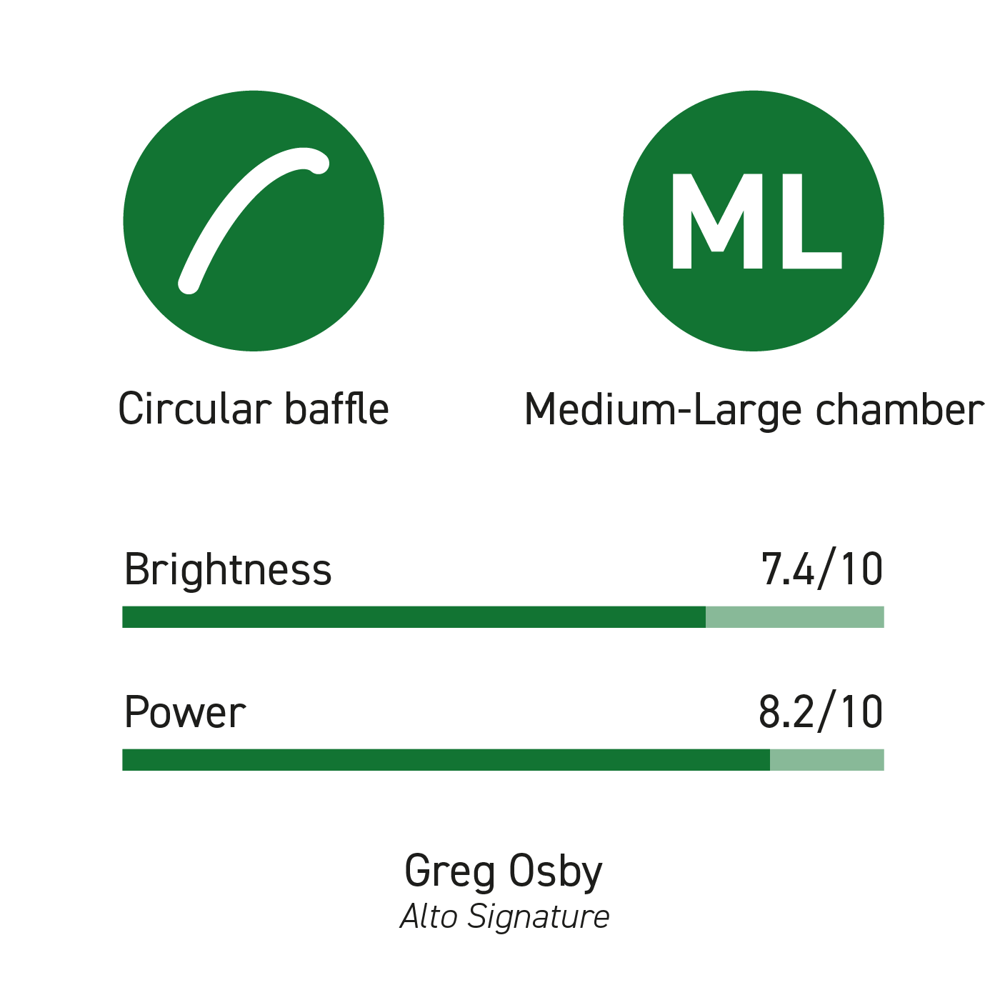 Greg Osby's signature mouthpiece has a raised circular baffle and a medium-large chamber, which gives a powerful and bright sound while keeping some flexibility and warmth in the tone.