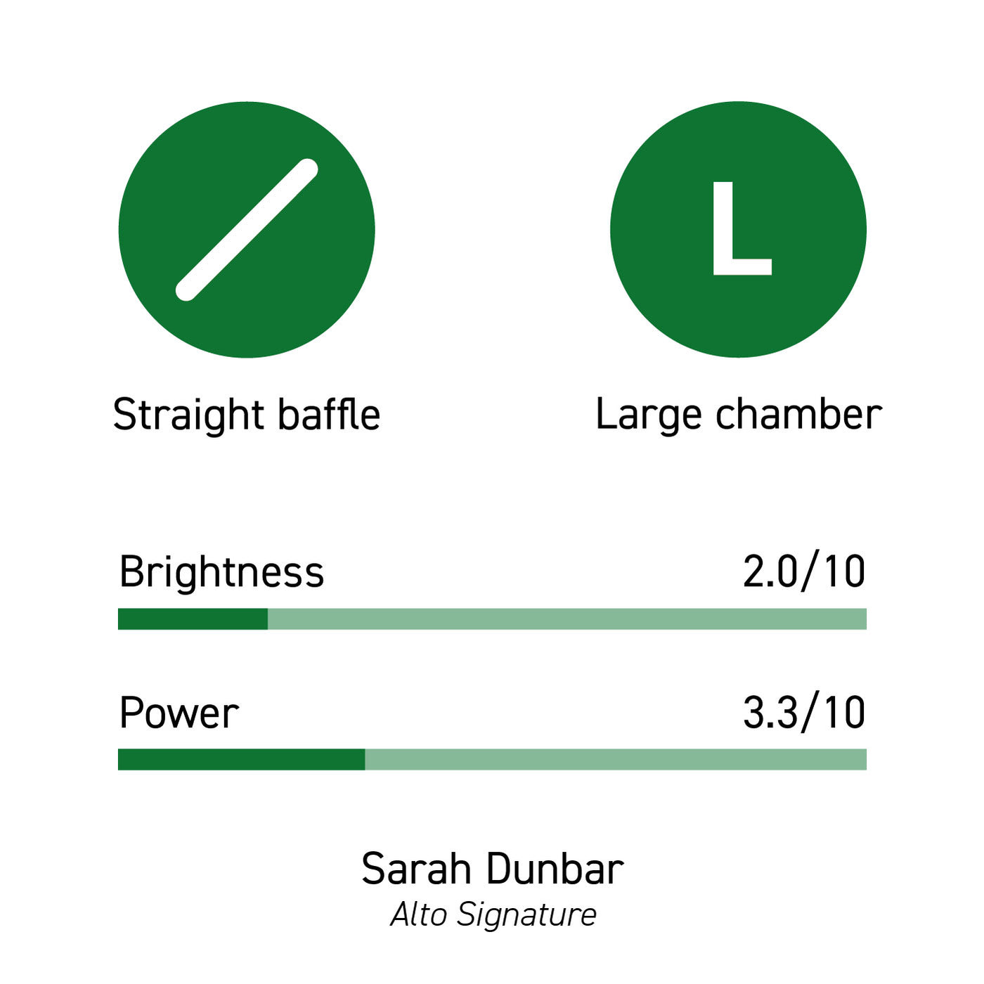 Avec sa chambre large et son plafond droit, le bec Alto de Sarah Dunbar vous offrira un son mat, rond et chaleureux avec une grande facilité d'émission.